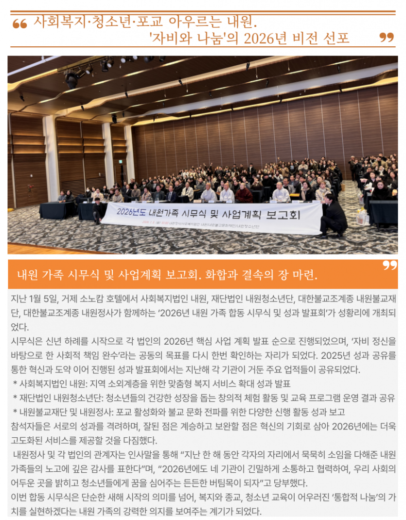 지난 1월 5일, 거제 소노캄 호텔에서 사회복지법인 내원, 재단법인 내원청소년단, 대한불교조계종 내원불교재단, 대한불교조계종 내원정사가 함께하는 ‘2026년 내원 가족 합동 시무식 및 성과 발표회’가 성황리에 개최되었다.