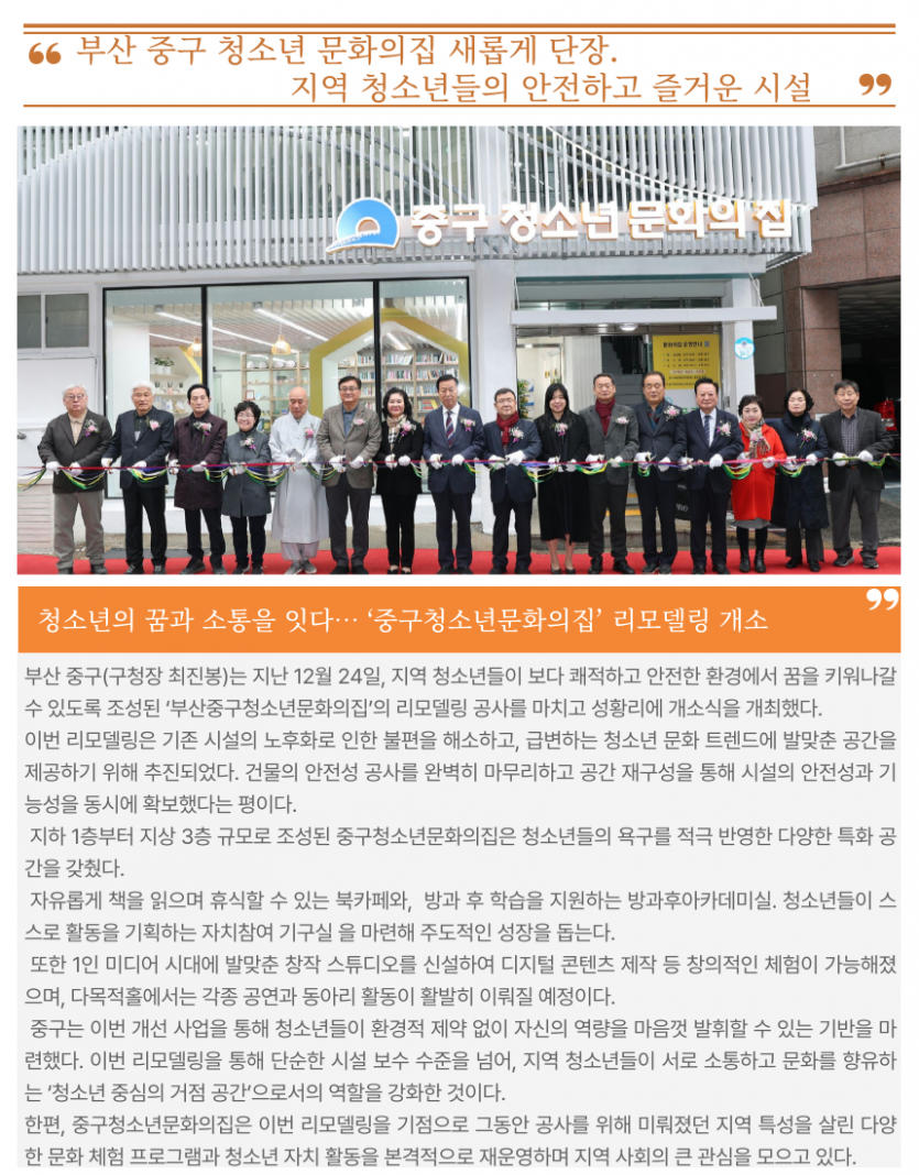 부산 중구(구청장 최진봉)는 지난 12월 24일, 지역 청소년들이 보다 쾌적하고 안전한 환경에서 꿈을 키워나갈 수 있도록 조성된 ‘부산중구청소년문화의집’의 리모델링 공사를 마치고 성황리에 개소식을 개최했다.