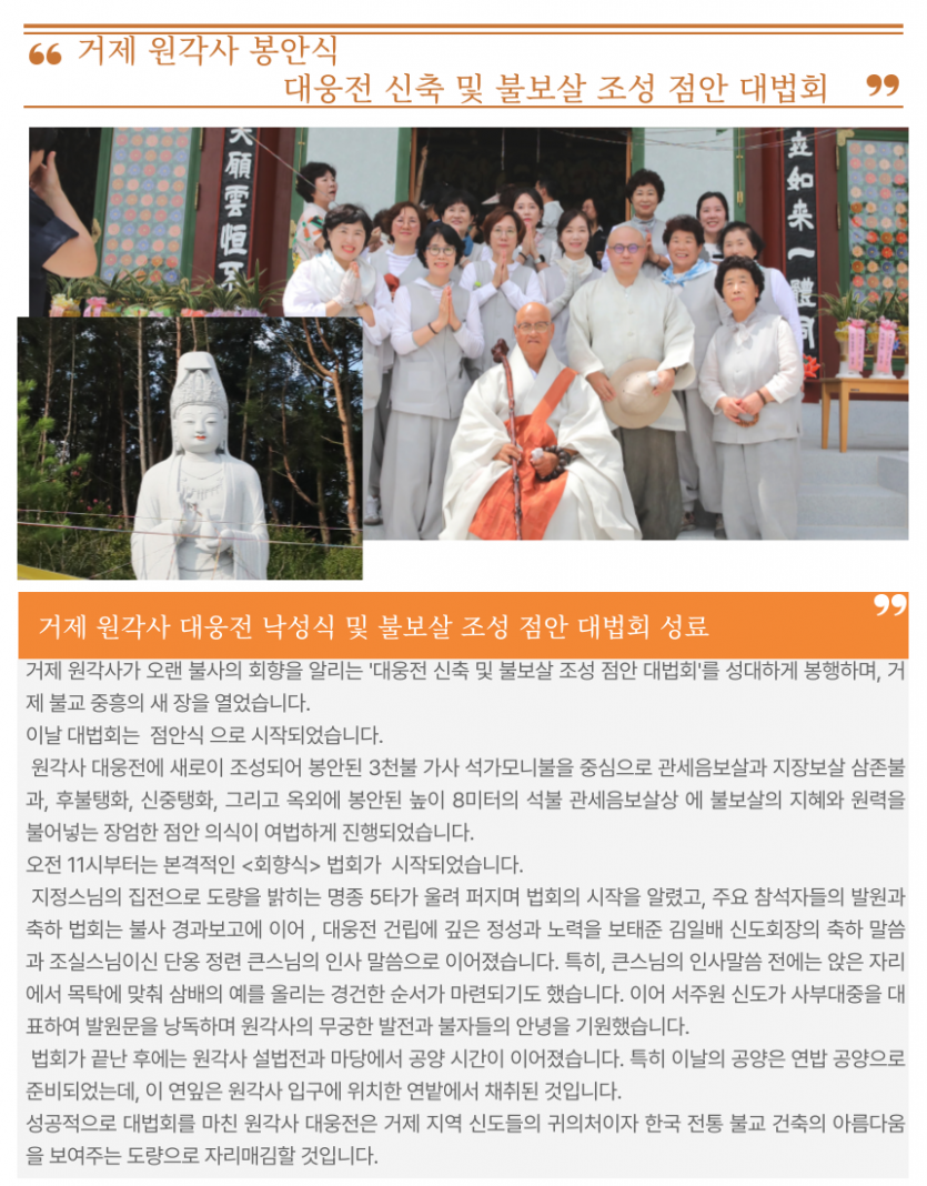 거제 원각사 대웅전 낙성 및 불보살 조성 점안 대법회 성료 보고